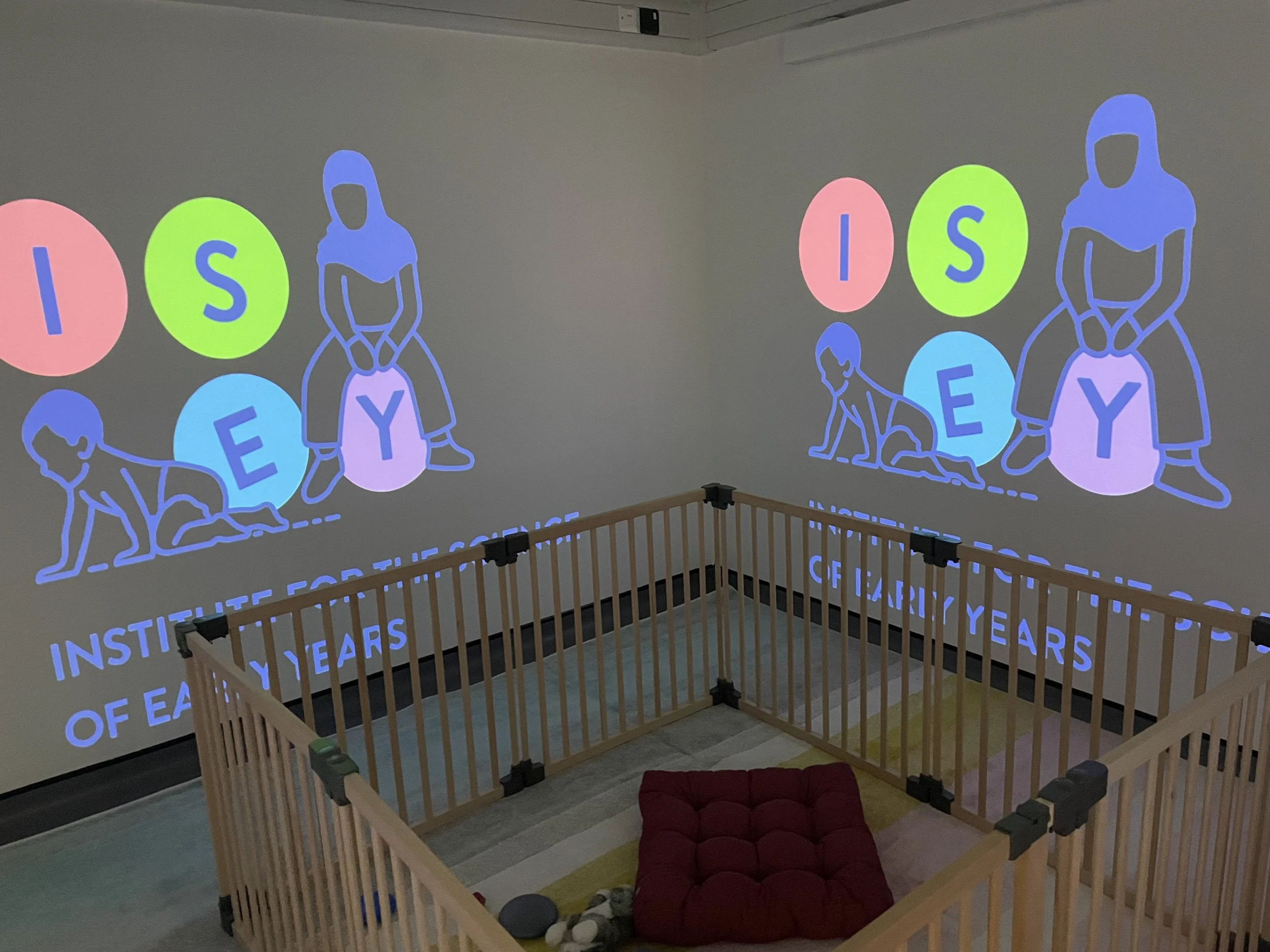 The Imaginarium Lab is an immersive research room designed to study how young children learn and interact with their surroundings. Four walls are equipped with large, floor-to-ceiling projections that can instantly transform the space into settings such as a forest, ocean, classroom, or a multi-sided 3D environment. Although the system supports full 360° projection, the primary focus is on the four-wall display to create an engaging yet comfortable experience. At the center is a safe, open play area where infants and young children can move, explore, and interact naturally with caregivers.