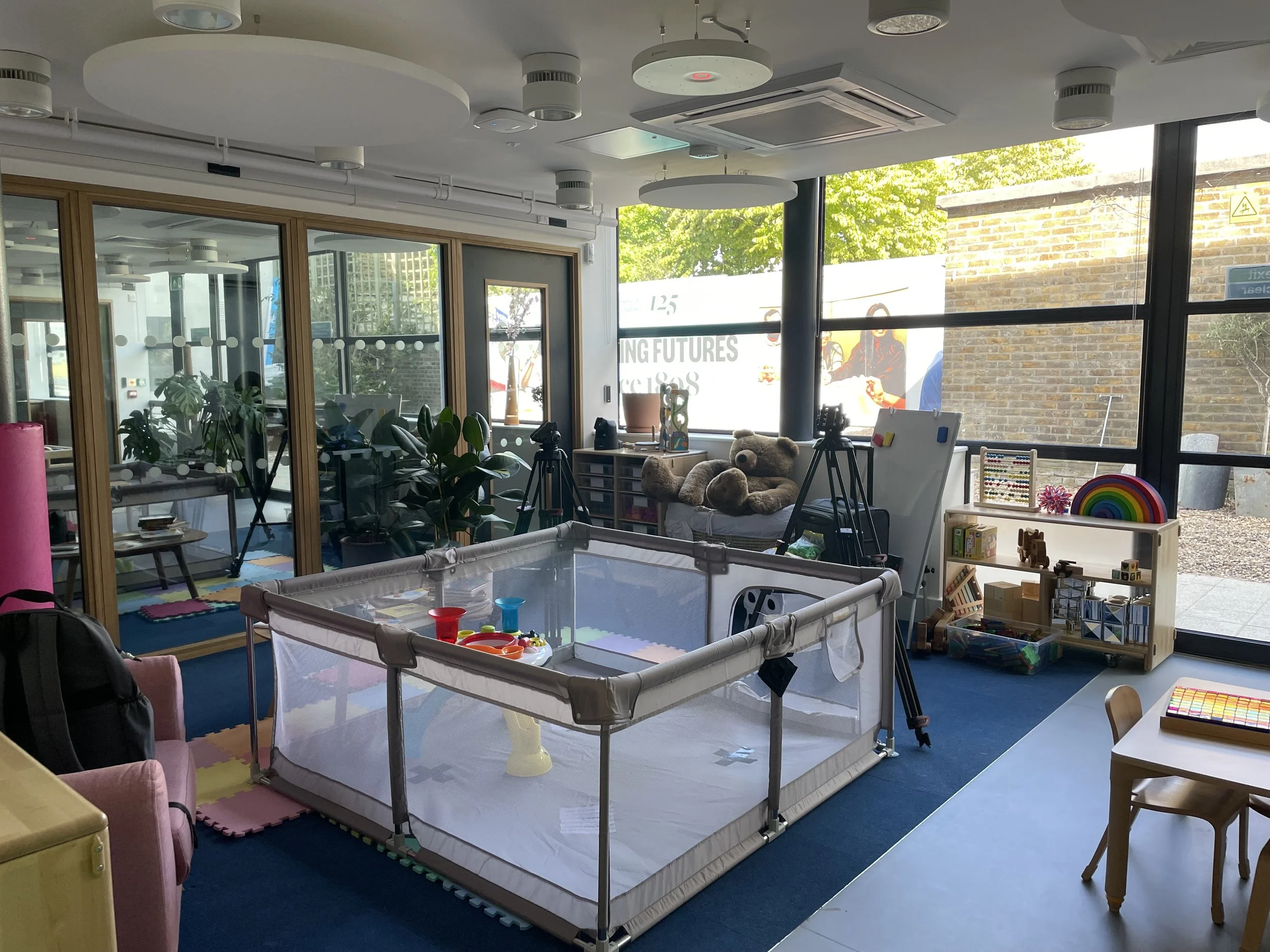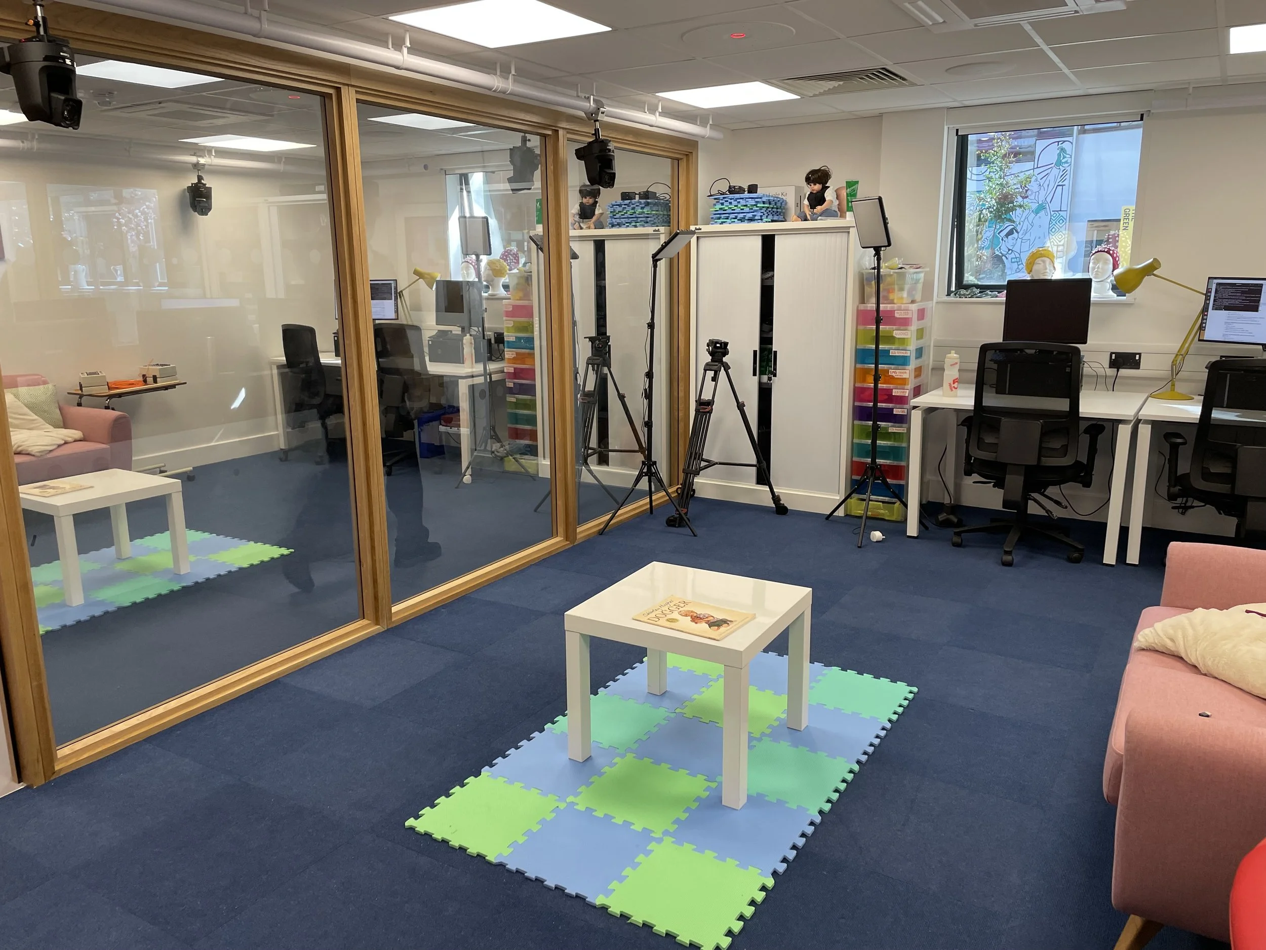 The room is equipped with child-friendly technologies that operate quietly in the background. Wearable sensors capture brain activity, heart rate, vocalizations, and eye movements, while six OptiTrack motion-capture cameras track actions such as reaching, crawling, and pointing. These tools allow researchers to observe how children respond to different environments, interact with parents, and explore the space, providing high-quality data in a setting that feels natural and welcoming.